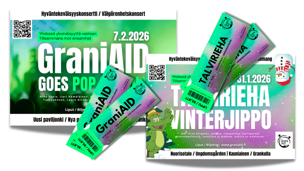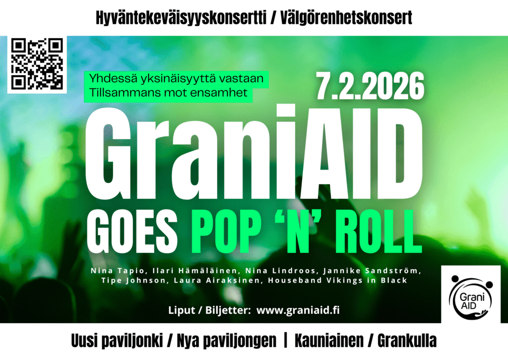 GraniAID on vuosittainen hyväntekeväisyyskonsertti, joka kokoaa yhteen musiikin, yhteisön ja Kauniaisten lämpimän paikallishengen. Illan ohjelmassa kuullaan mm. Nina Lindroos, Houseband Vikings in Black, Nina Tapio, Jannike Sandström, Laura Airaksinen, Tipe Johnson ja Ilari Hämäläinen – luvassa on energinen, tunnelmallinen ja unohtumaton konserttikokemus.