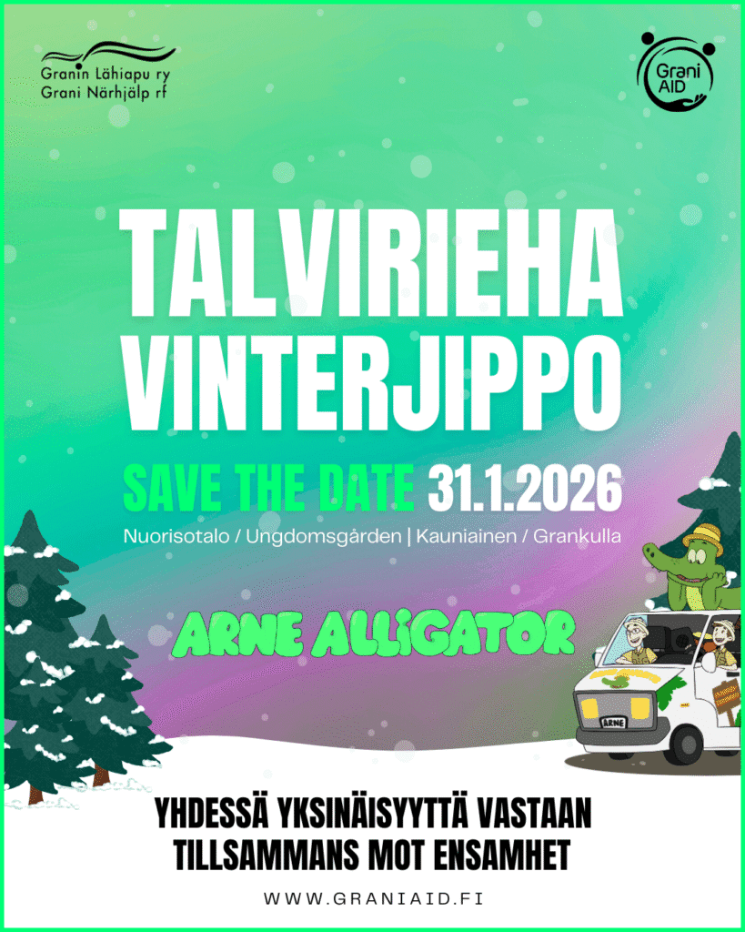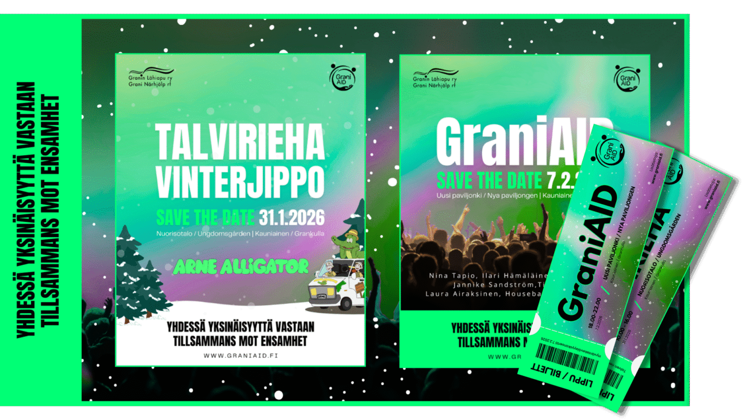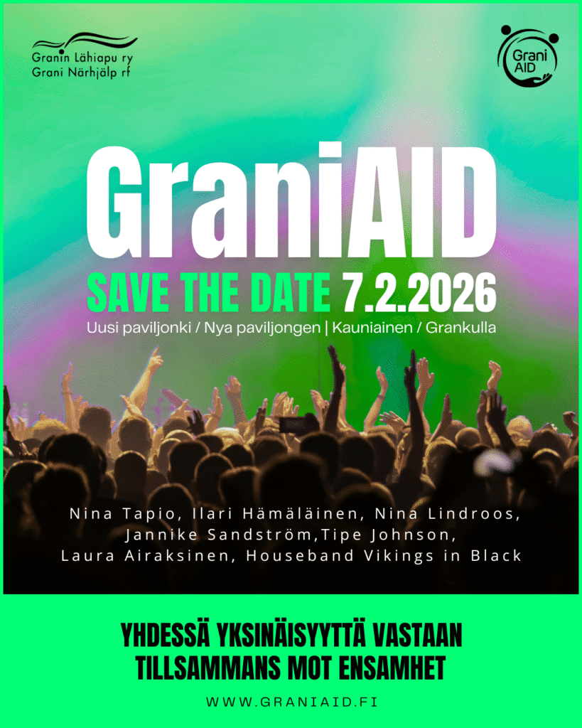 GraniAID kokoaa jälleen yhteen musiikin, yhteisön ja hyvän tekemisen! Lavalla nähdään upeat artistit: Nina Tapio, Ilari Hämäläinen, Nina Lindroos, Jannike Sandström, Tipe Johnson, Laura Airaksinen ja Houseband Vikings in Black.